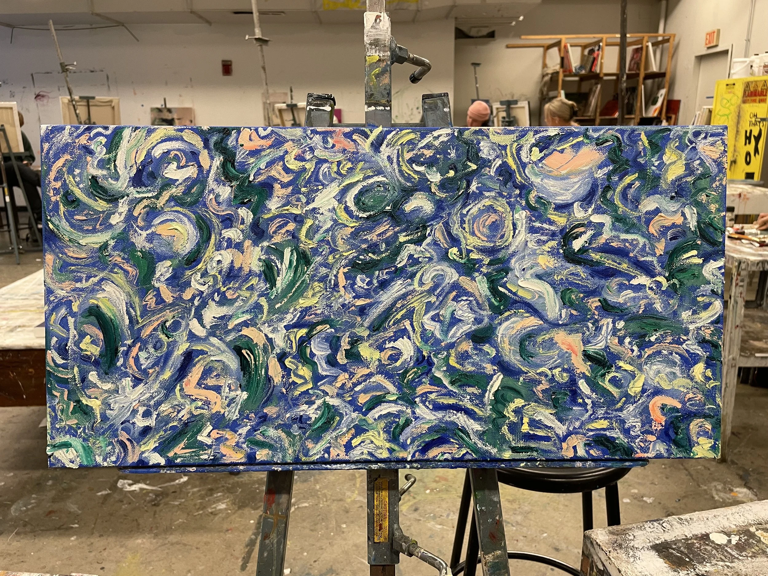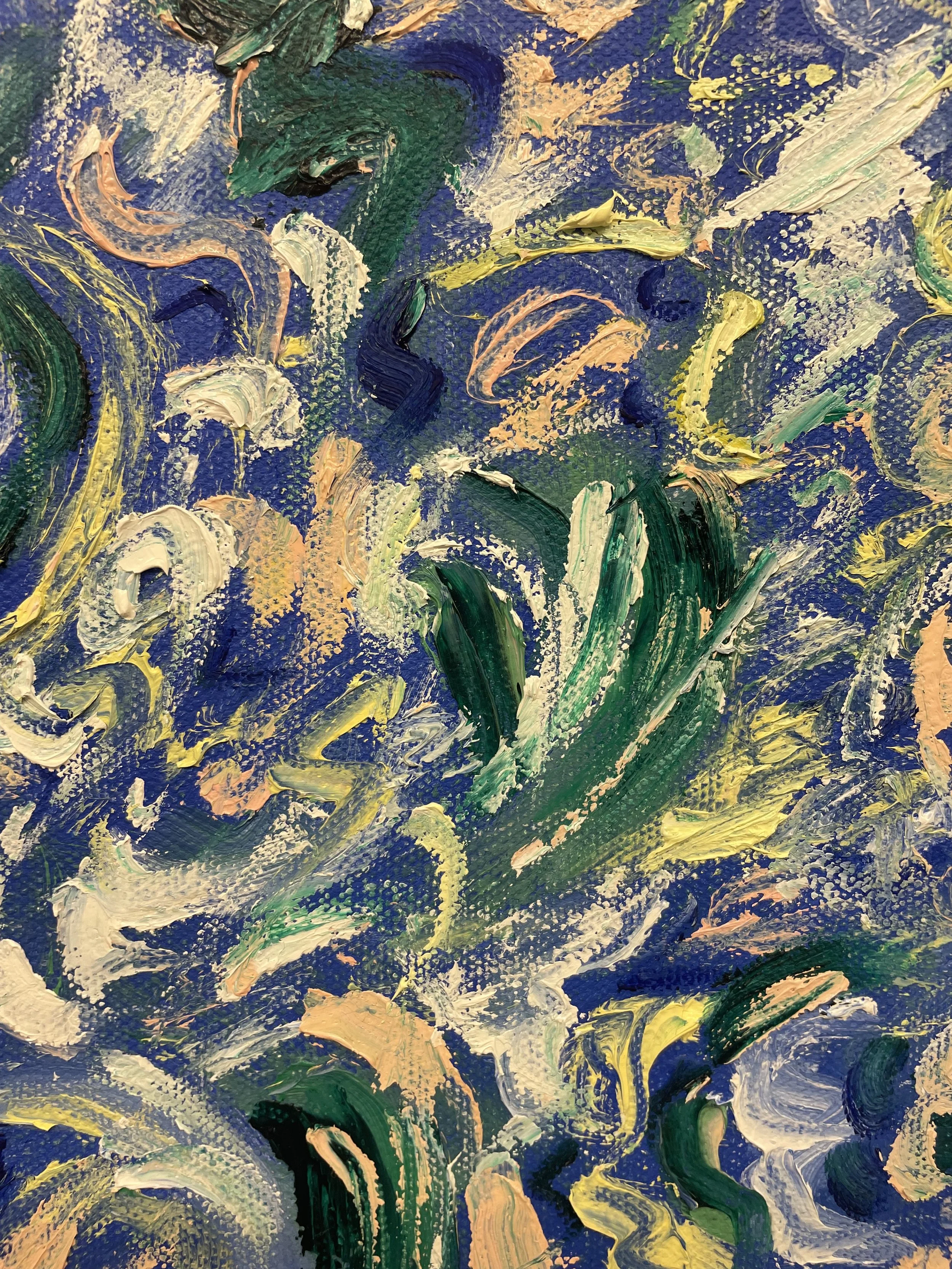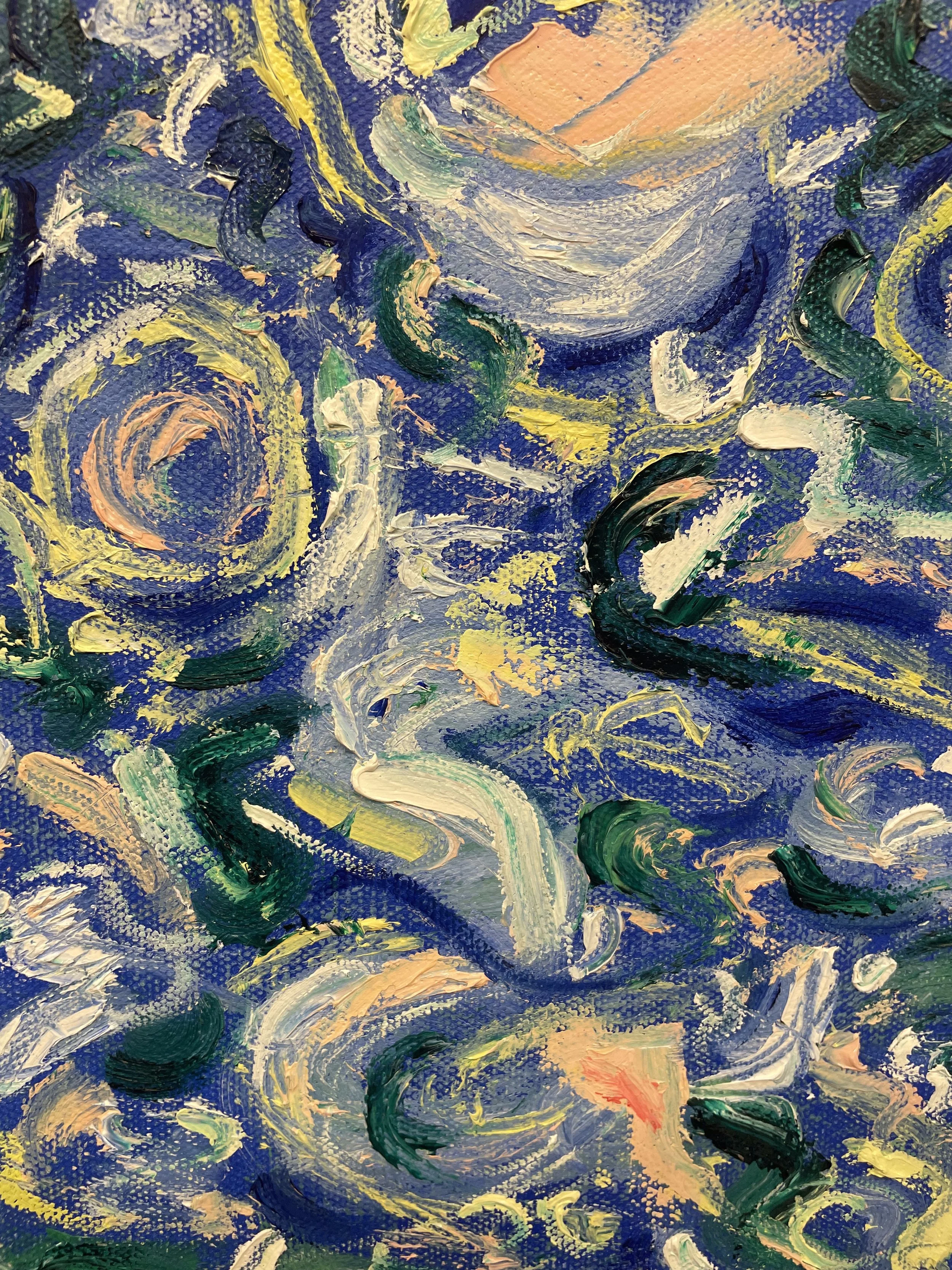 This piece seeks to answer a question: Does music or sounds we listen to have an effect on the art we create? I listened to music from Duran Duran while completing this piece and focused on the feelings of their music. I painted with colors and motions I visualized while listening to their songs.